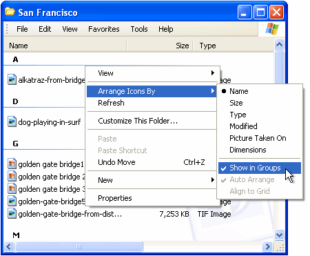 Отворете папка, която съдържа няколко подпапки и типове файлове. Щракнете с десния бутон върху произволно празно пространство на екрана "Съдържание" на прозореца, посочете към Подреждане на икони от и след това щракнете върху Покажи в групи. За да подредите съдържанието на прозореца, щракнете с десния бутон върху отново в произволно празно пространство на екрана "Съдържание" прозорец, посочете към Подреждане на икони от, и щракнете върху Име, Размер, Тип или на промяна (избор може да варира в зависимост от съдържанието).